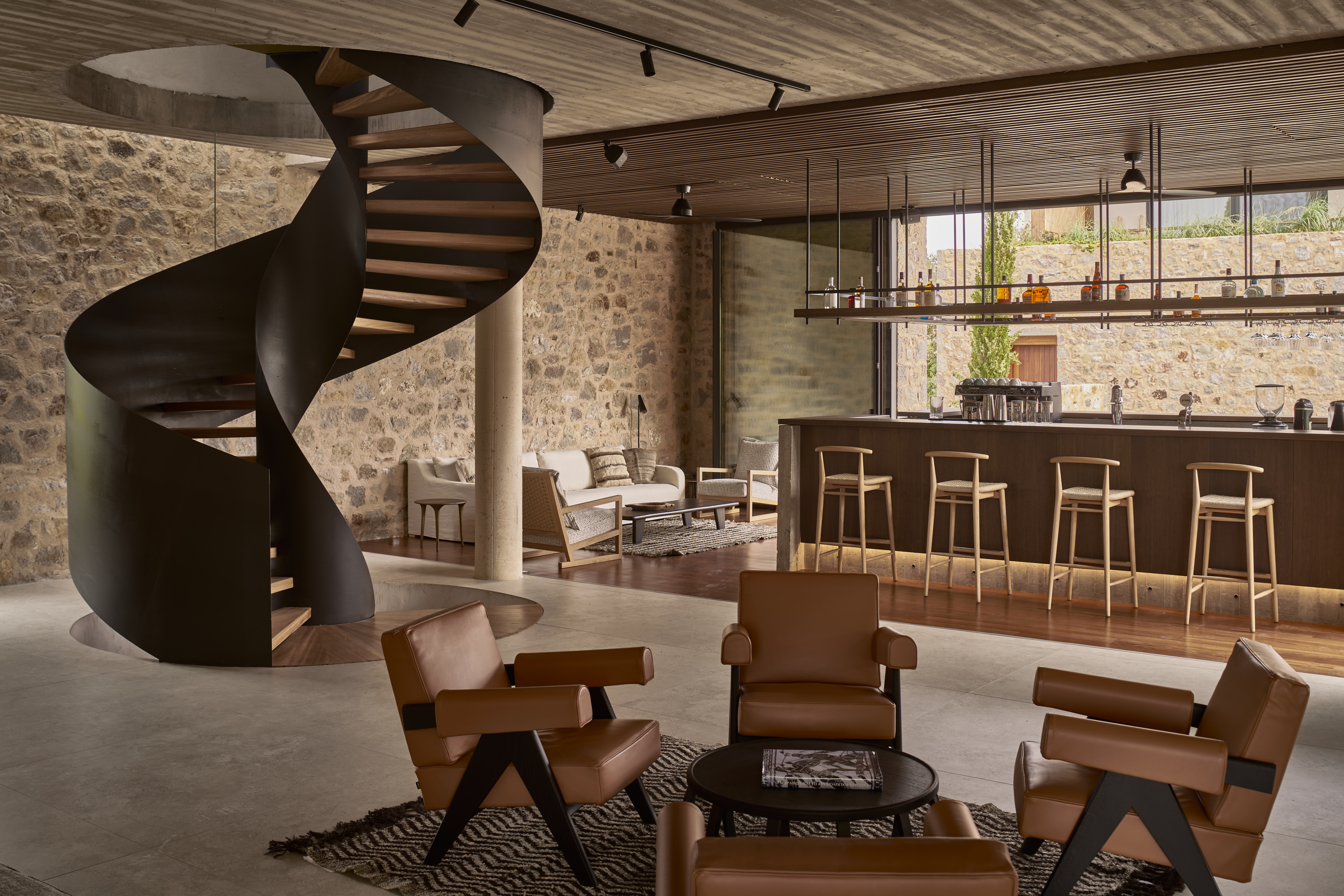 Η αρχιτεκτονική σύνθεση μοιράζεται κοινή γλώσσα με το αδελφό ξενοδοχειακό συγκρότημα, αντλώντας έμπνευση από την αρχετυπική δομή του ελληνικού χωριού, την οποία αναπλάθει μέσα από σύγχρονο λεξιλόγιο και καθαρές αρχιτεκτονικές χειρονομίες. Οι δομημένοι όγκοι, με κυρίαρχη την κυβική γεωμετρία, αρθρώνονται μέσω μιας υλικότητας που συνδυάζει τοπική λιθοδομή, αδρό ξύλο και ελληνικό μάρμαρο — στοιχεία που αγκυρώνουν το σύνολο αρμονικά μέσα στο φυσικό τοπίο και το πολιτισμικό του πλαίσιο.
